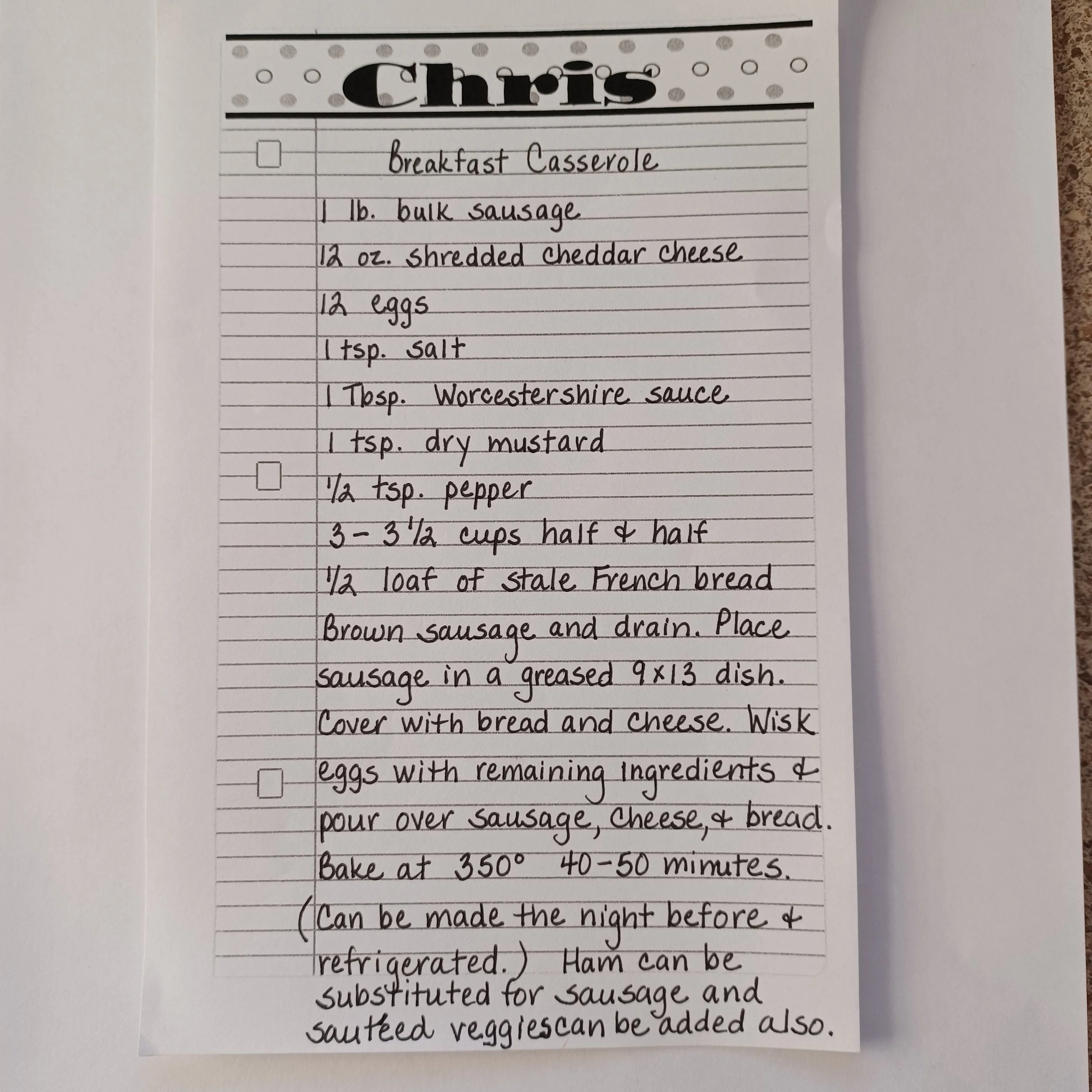 This recipe for breakfast casserole was handwritten by my mom, Christie Lauritzen, and is the recipe that she used when I was growing up in the Midwest. I use this recipe as a template, often omitting the sausage and instead adding whatever sautéed veggies I have in my fridge. To be honest, the simplest combination of eggs, good cheddar cheese, milk, and stale baguette is my favorite. Don’t forget the salt, pepper, and dry mustard (which honestly adds an important flavor note). Worcestershire is optional (I completely forgot this ingredient was in the recipe and don’t typically use it, especially in vegetarian versions). When working at a retreat with Sonya a few years ago, I discovered that a generous drizzle of Tapatio hot sauce at the table takes it to another level.